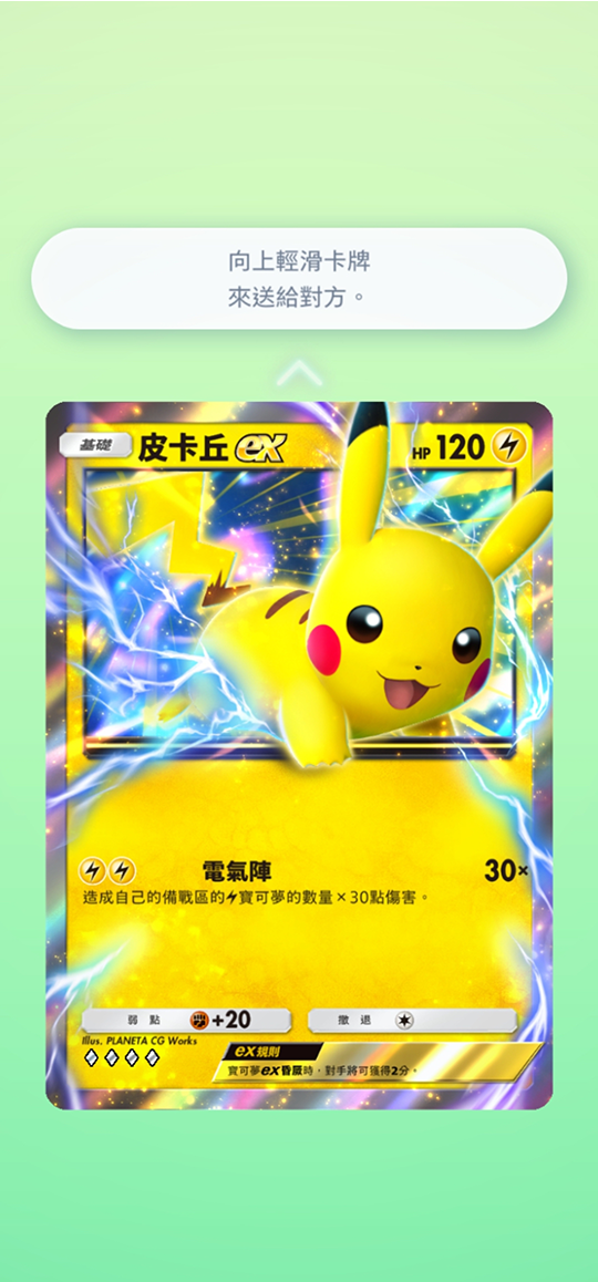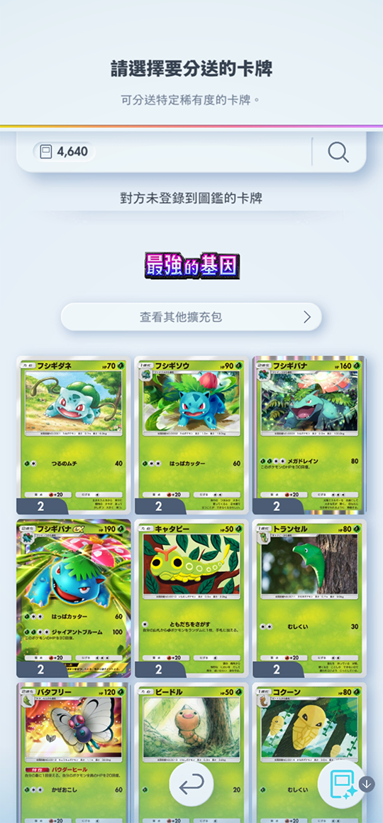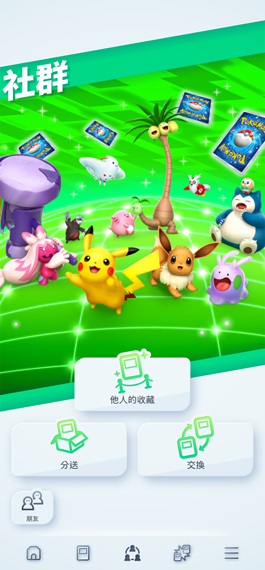 您也可以使用「交換」功能和朋友交換寶可夢卡牌。互相給對方看看卡牌包的圖鑑,交換彼此想要的卡牌吧。